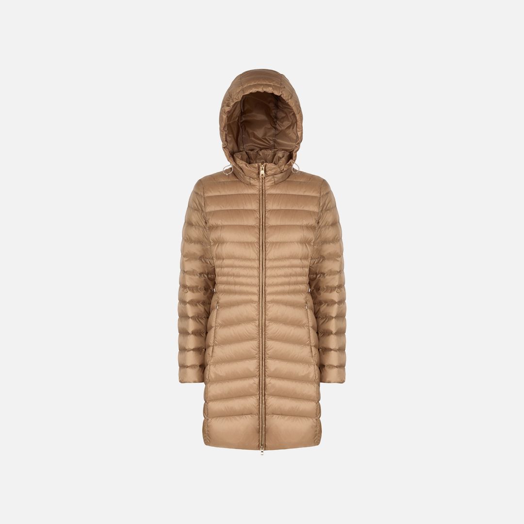 Béžová dámska prešívaná bunda Geox Jaysen s kapucňou udržiava teplo aj pri -5°C a odvádza vlhkosť pri aktívnom pohybe.
