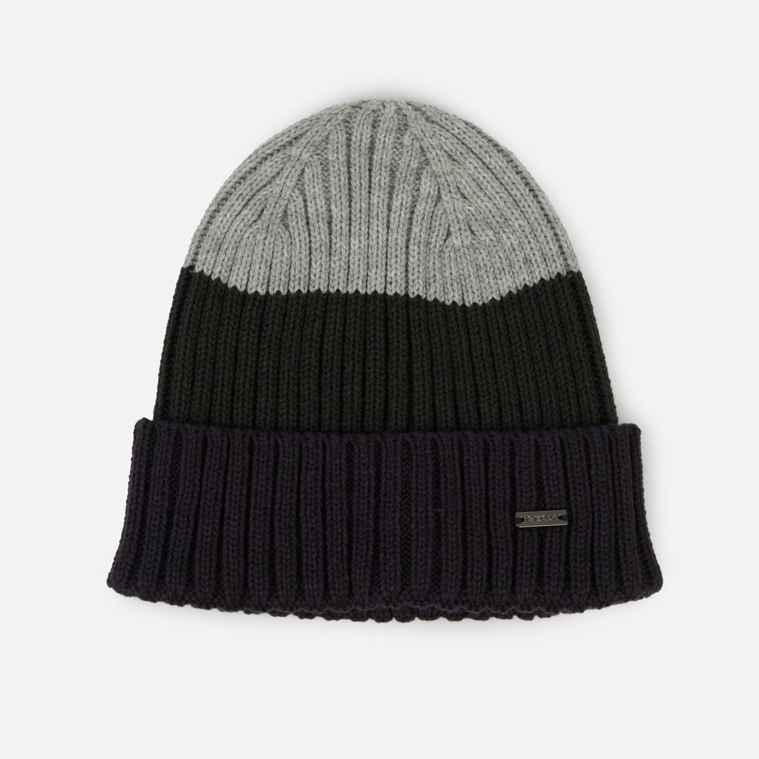 Černá pánská zimní čepice Geox Yvan s trojfarebným dizajnom a kovovým logom, ktorá udržiava hlavu v teple počas zimných prechádzok a športových aktivít vonku.