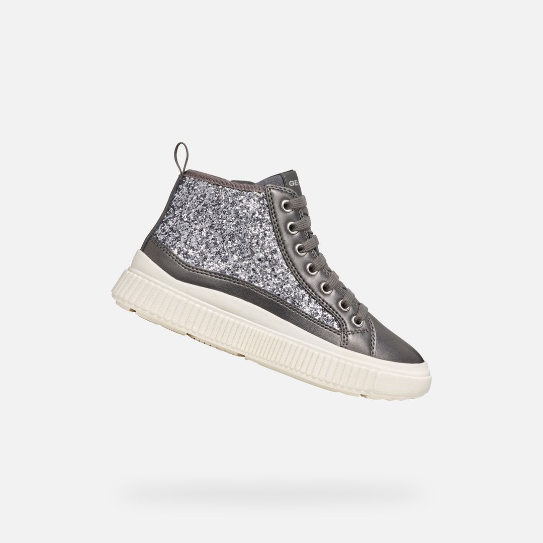 Strieborná dievčenská kotníková obuv Geox Laquinny Girl s trblietavými detailmi na šnurovanie pre školné dni a mestské prechádzky.