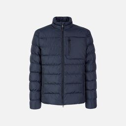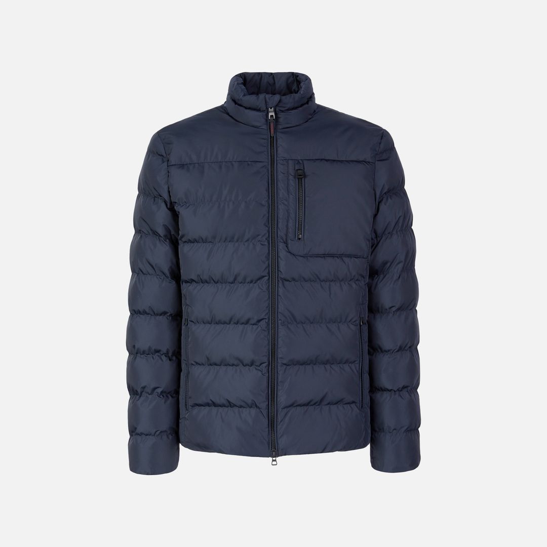 Tmavě modrá pánská péřová bunda Geox Snake s prešívaným dizajnom a praktickými vreckami pre chladné dni a aktívne nosenie.